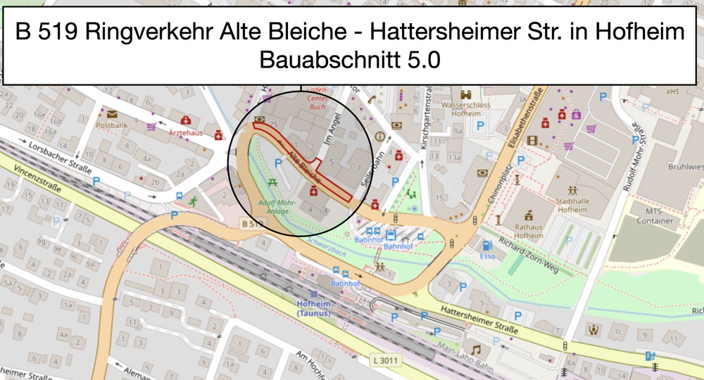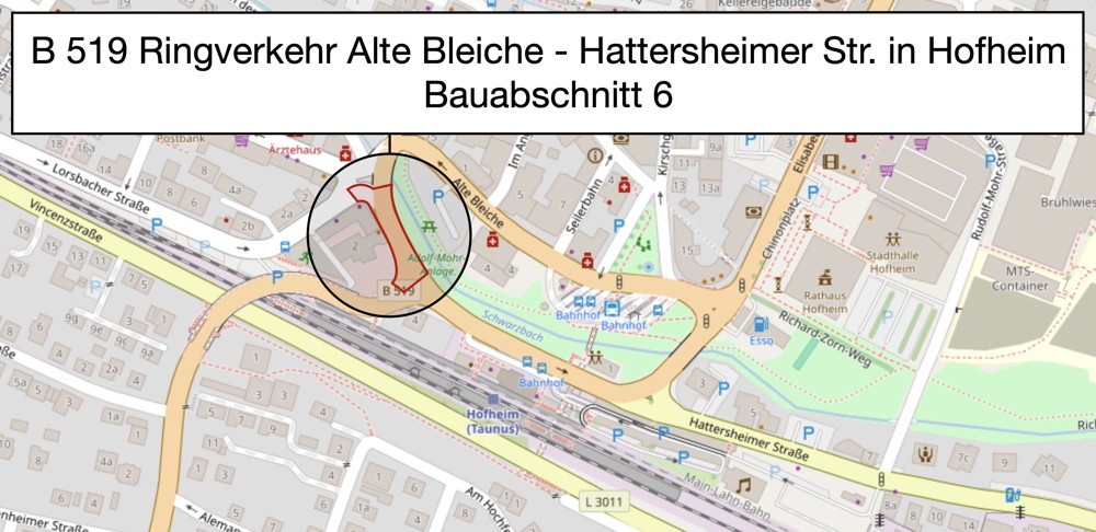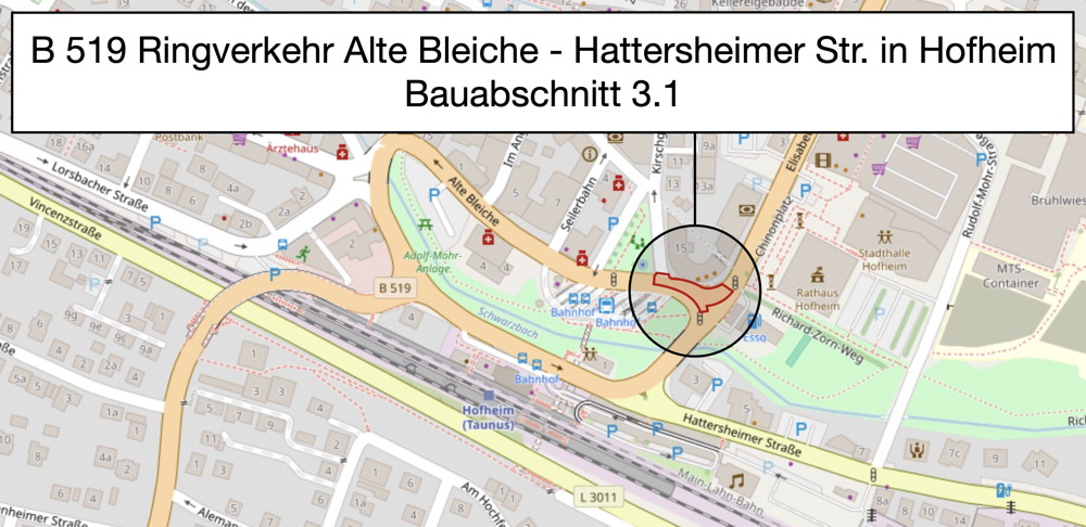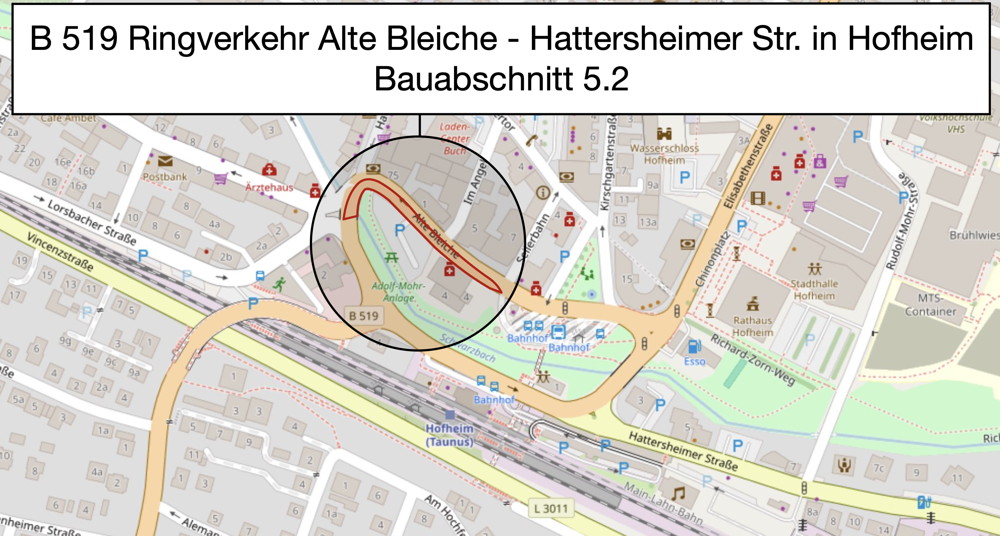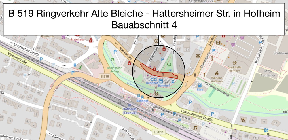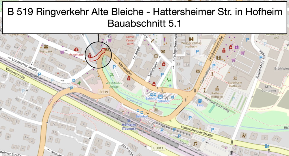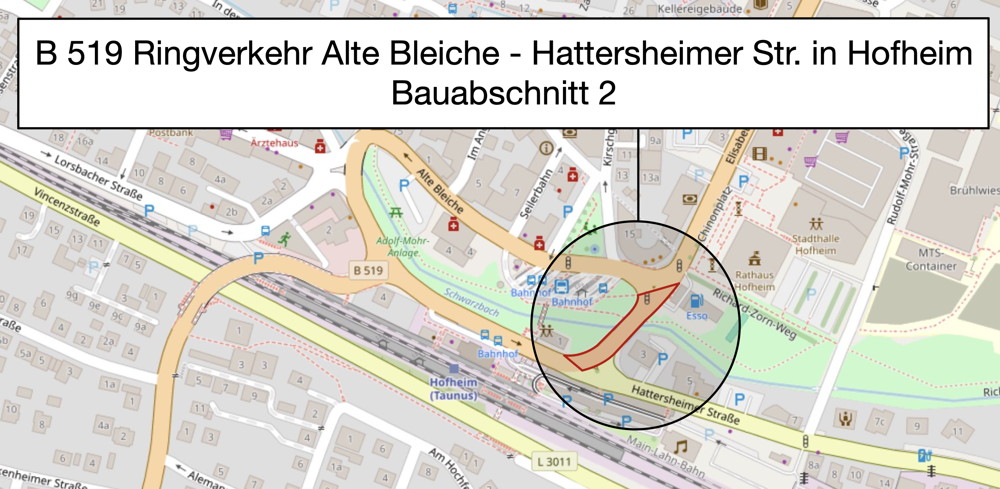 Noch im September startet die umfassende Sanierung der Bundesstraße 519 in Hofheim am Taunus. Die Bauarbeiten sind eng abgestimmt mit der Stadt Hofheim und umfassen neben der Erneuerung der Fahrbahn auch die Modernisierung von Versorgungsleitungen, die Erneuerung der Ampelanlagen und den barrierefreien Ausbau der Gehwege. Parallel dazu gestaltet die Stadt Hofheim den Bahnhofsvorplatz neu.