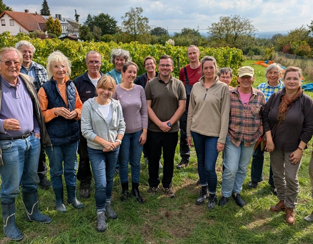 Ein diesiger Morgen im Herbst 2025: Die Stadt Hofheim hat zur Weinlese an den Diedenbergener Sonnenhang eingeladen. Zwischen den Reihen der Rebstöcke herrscht schnell geschäftiges Treiben. Freiwillige Helferinnen und Helfer bücken sich mit Scheren in der Hand, um die reifen Trauben zu ernten. Begrüßt wurden sie von Jana Seidemann, die gemeinsam mit ihrer Familie seit den 1990er-Jahren den Weinberg bewirtschaftet. Mit Geduld und Erfahrung steht sie den „nicht-professionellen“ Lesehelfern zur Seite – und vermittelt dabei auch ein Stück lebendige Tradition.