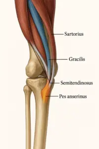 Unterhalb der Innenseite des Knies treffen sich drei Muskeln: der Musculus Sartorius, der Musculus Gracilis und der Musculus Semitendinosus. Sie setzen dort gemeinsam an einem Sehnenpunkt an, der den etwas ungewöhnlichen Namen Pes anserinus trägt, was übersetzt „Gänsefuß“ bedeutet – weil die Form an die Spreizung einer Gans erinnert.