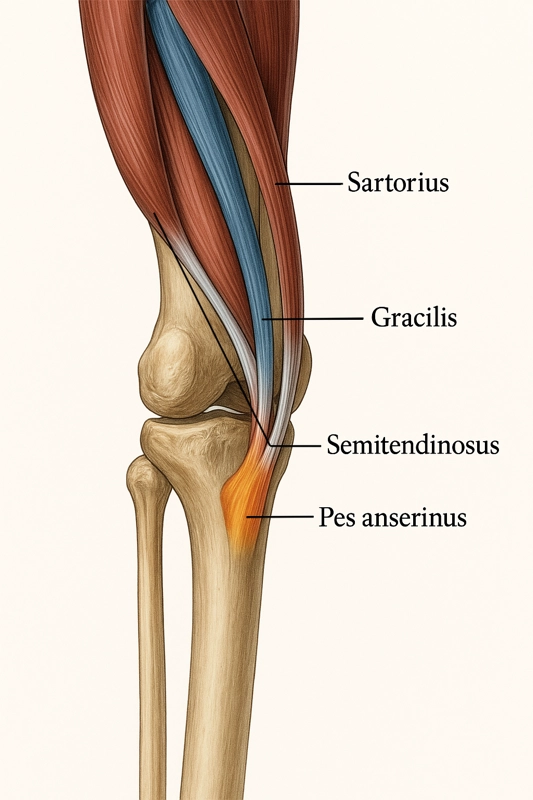 Unterhalb der Innenseite des Knies treffen sich drei Muskeln: der Musculus Sartorius, der Musculus Gracilis und der Musculus Semitendinosus. Sie setzen dort gemeinsam an einem Sehnenpunkt an, der den etwas ungewöhnlichen Namen Pes anserinus trägt, was übersetzt „Gänsefuß“ bedeutet – weil die Form an die Spreizung einer Gans erinnert.