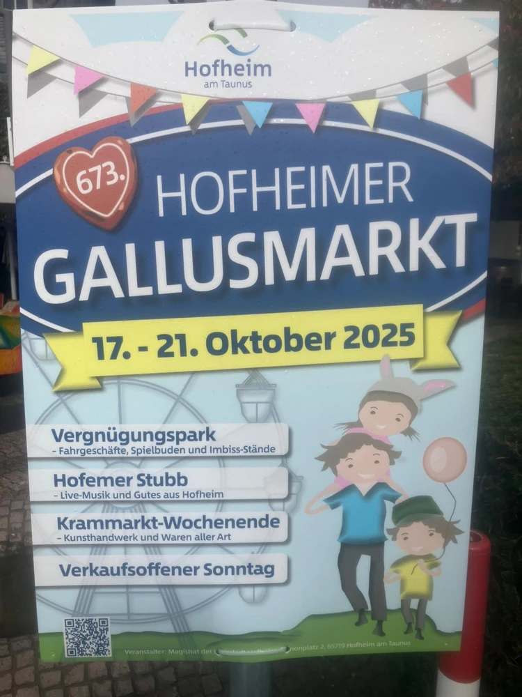Zum 673. Mal feiern die Hofheimerinnen und Hofheimer den Gallusmarkt. Von Freitag, 17. Oktober, bis Dienstag, 21. Oktober, öffnet der Vergnügungspark mit Fahrgeschäften und Imbissbuden. Am Wochenende, 18. und 19. Oktober, säumen zusätzlich Marktstände und Kunsthandwerker-Stände die Straßen und Plätze in der Innenstadt. Außerdem freuen sich die Hofheimer Fachgeschäfte und die Gastronomiebetriebe auf Besucherinnen und Besucher – auch am verkaufsoffenen Sonntag in der Zeit von 13 bis 18 Uhr.