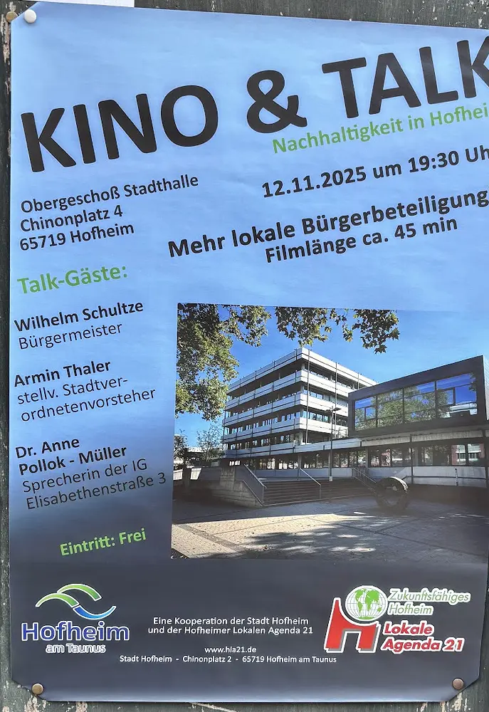Mit der Reihe „Kino & Talk“ bietet die Hofheimer Lokale Agenda regelmäßig Filme und Diskussionen zu Themen an, die die Stadtgesellschaft bewegen – offen, kritisch und konstruktiv: Mittwoch, 12. November 2025, 19:30 Uhr, Stadthalle Obergeschoss, Eintritt frei.