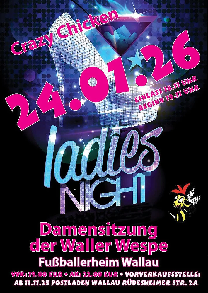 Am 24. Januar 2026 heißt es im Fußballerheim Wallau wieder: It’s Ladies Night!  Die legendäre Crazy Chicken Ladies Night verspricht auch in diesem Jahr ein prall gefülltes Programm voller Überraschungen, Spaß und Entertainment. Das bewährte Dreigestirn führt charmant und mit viel Witz durch den Abend – und Frau darf gespannt sein, was sie erwartet!