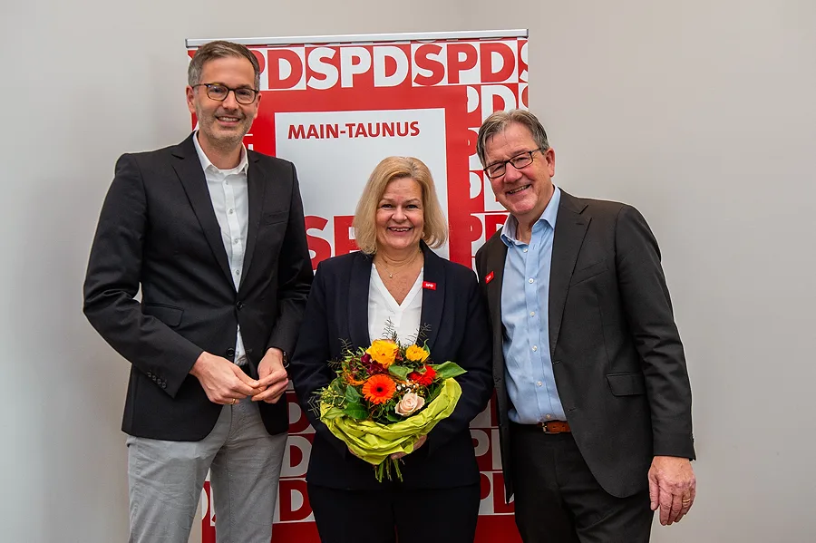 Bundestagsabgeordnete Nancy Faeser, flankiert von Kreisvorsitzendem Bernhard Köppler (re.) und Spitzenkandidat Philipp Neuhaus.