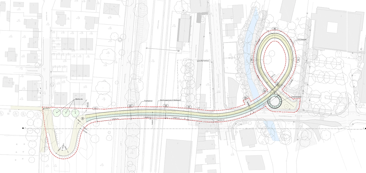 Die Brücke soll im kleinen Richard-Zorn-Park hinter Rathaus und Tankstelle beginnen. Radfahrer gelangen über eine 3,5 Meter breite Schleife nach oben, Fußgänger können eine Treppe nutzen, um den rund 7,5 Meter hohen Höhenunterschied zu überwinden.