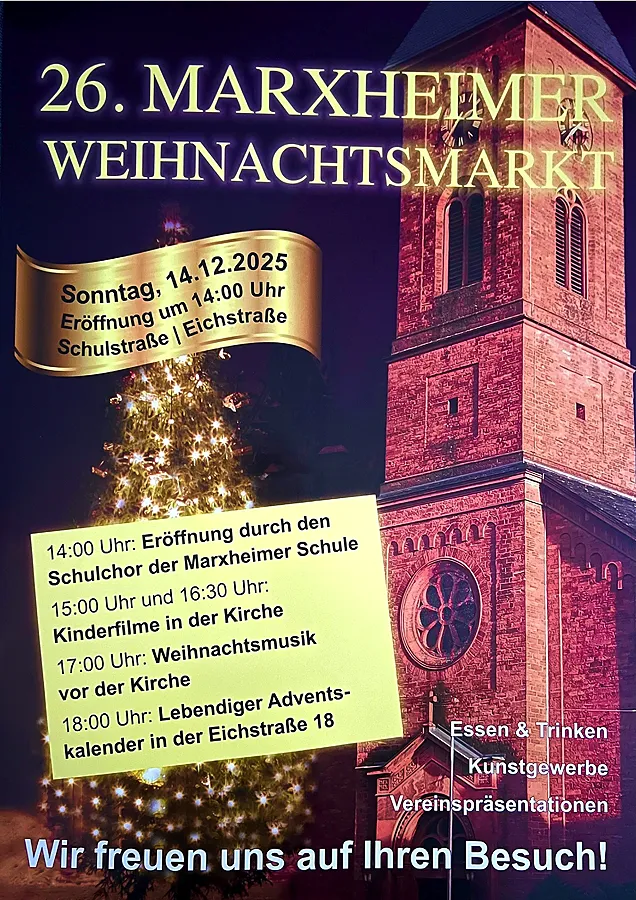 Zur offiziellen Eröffnung um 14 Uhr haben sich Bürgermeister Wilhelm Schultze und Ortsvorsteher Günter Westenberger angekündigt, begleitet vom Schulchor der Marxheimer Schule. Im Laufe des Nachmittags stehen weitere Highlights auf dem Programm: Kinderfilmvorführungen in der Pfarrkirche St. Georg um 15 und 16:30 Uhr, ein festliches Bläserquartett um 17 Uhr vor der Kirche sowie die Öffnung eines Fensters des Lebendigen Adventskalenders der katholischen und evangelischen Gemeinden Marxheim und Diedenbergen um 18 Uhr in der Eichstraße 18.