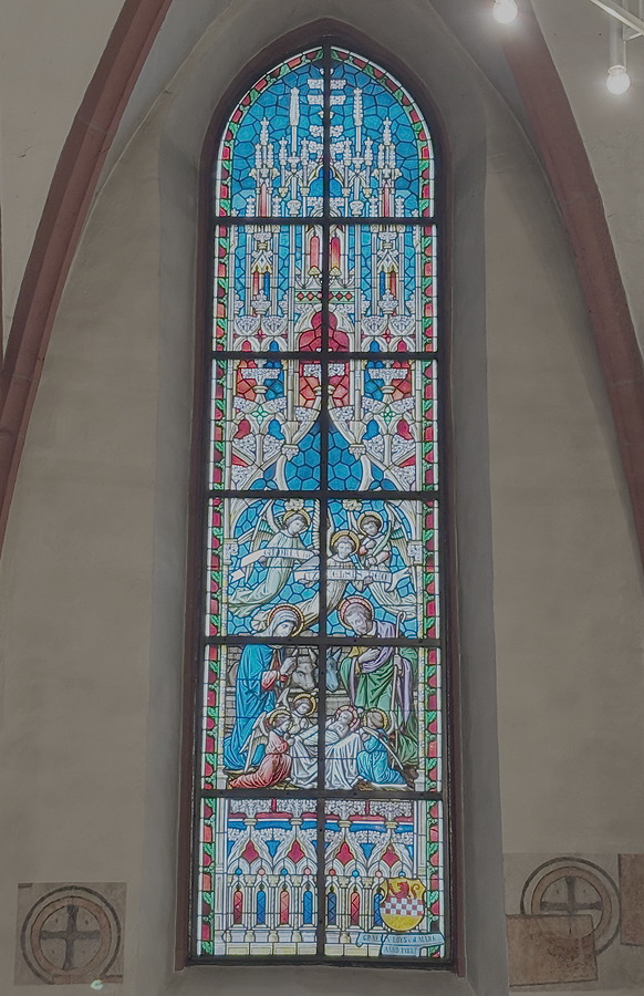 Unser Bild oben zeigt eines der Marienfenster der Pfarrkirche St. Peter und Paul in Hofheim. Über der Hauptszene – der Geburt des göttlichen Kindes im Stall von Bethlehem – schweben Engeln, die den Schriftzug „Ehre sei Gott in der Höhe“ tragen. Die Engel am Fuß der Krippe sind in Blau und Rot gekleidet, wie Maria selbst: Farben, die Treue, Schmerz, aber auch den Sieg symbolisieren.