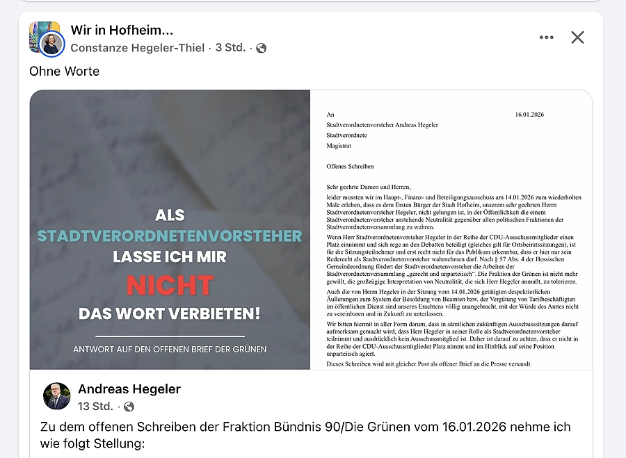 Hegeler reagierte umgehend – allerdings nicht in einem persönlichen Gespräch, sondern in eben jenen sozialen Medien, denen er zuvor noch negative Stimmungsmache gegen Hofheim vorgeworfen hatte. „Unparteilichkeit bedeutet nicht Sprachlosigkeit. Ich lasse mir nicht das Wort verbieten“, schrieb er auf Facebook. Er betont in seinem Post, dass er seine Rolle nicht mit Fraktionszugehörigkeit vermische oder parteipolitisch agiere. Dann folgt der Satz, der das Problem auf den Punkt bringt: „Eine Einschränkung des Rederechts widerspricht nicht nur der Gemeindeordnung, sondern auch dem Geist der demokratischen Debattenkultur.“