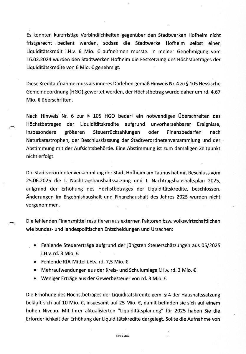 Der Brief beginnt vergleichsweise harmlos. Cyriax erinnert daran, dass der Kreis mit Genehmigung vom 16. Februar 2024 den Doppelhaushalt 2024/25 der Stadt Hofheim freigegeben hatte. Verbunden damit: die Erlaubnis, in den Jahren 2024 und 2025 jeweils bis zu 15 Millionen Euro an sogenannten Liquiditätskrediten aufzunehmen.