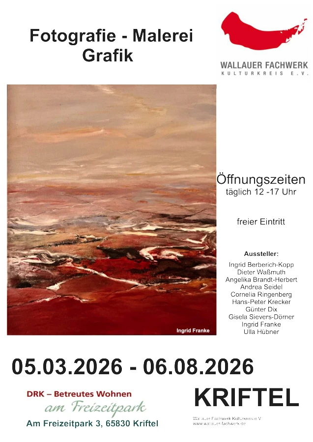 Parallel dazu läuft bis zum 6. August 2026 im DRK – Betreuten Wohnen in Kriftel (Am Freizeitpark 3) eine Ausstellung mit Fotografie, Malerei und Grafik. Hier präsentieren gleich zehn Mitglieder des Kulturkreises ihre Werke: Ingrid Berberich-Kopp, Dieter Waßmuth, Angelika Brandt-Herbert, Andrea Seidel, Cornelia Ringenberg, Hans-Peter Krecker, Günter Dix, Gisela Sievers-Dörner, Ingrid Franke und Ulla Hübner.