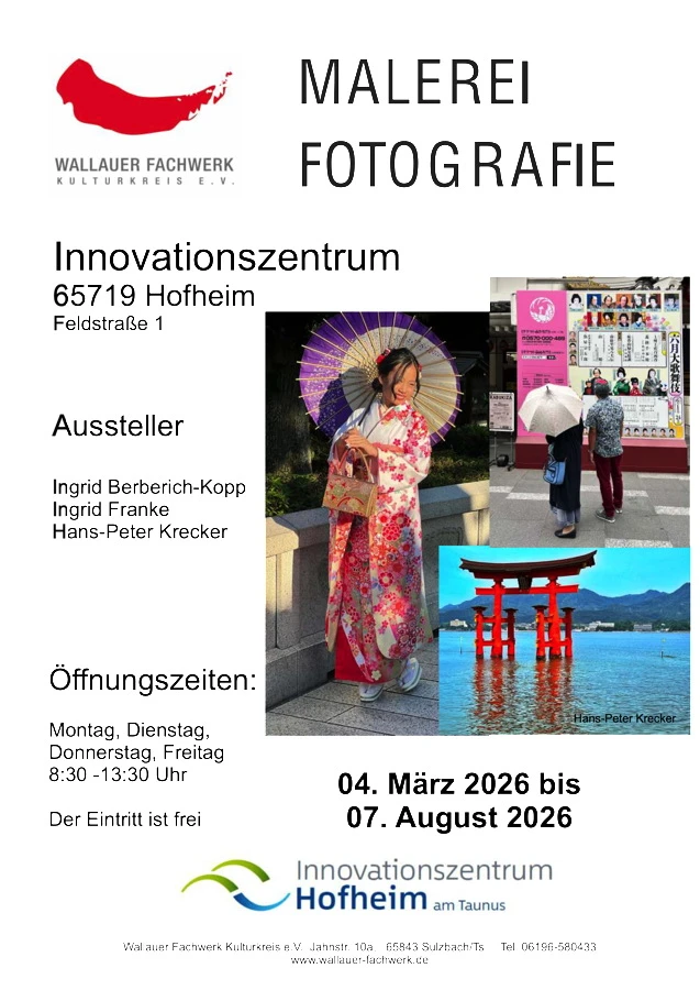 Der Kulturkreis Wallauer Fachwerk zeigt in diesem Frühjahr wieder ein vielseitiges Spektrum künstlerischer Arbeiten: Bis zum 7. August 2026 können Besucherinnen und Besucher im Innovationszentrum in Hofheim (Feldstraße 1) Malerei und Fotografie der Künstlerinnen und Künstler Ingrid Berberich-Kopp, Ingrid Franke und Hans-Peter Krecker entdecken.