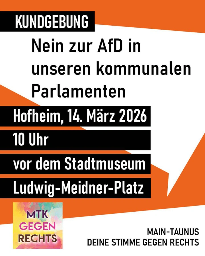 Eine nächste Gelegenheit bietet die konstituierende Sitzung der Hofheimer Stadtverordnetenversammlung am 22. April: Weil die AfD künftig im Stadtparlament vertreten sein wird, hat „MTK gegen Rechts“ eine Kundgebung auf dem Chinonplatz ab 17 Uhr angemeldet.